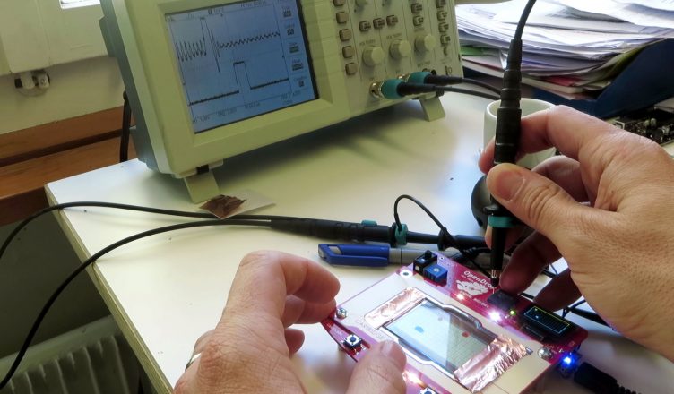 Measurement with droplet present under activated electrode. Upper line shows feedback signal from amplifier. With peak at the end of the switching periode.