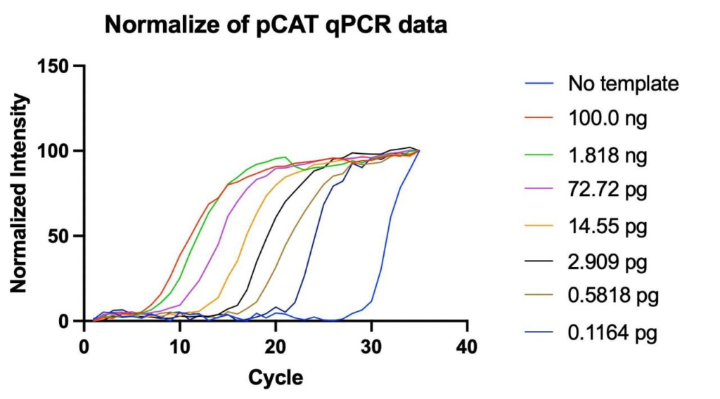Normalized qPCR amplification curves for the pCAT gene measured using the qPocketPCR system. Multiple samples with different template concentrations were amplified and plotted, ranging from 100 ng down to 0.1164 pg, along with a no-template control. The x-axis represents the PCR cycle number, while the y-axis shows normalized fluorescence intensity, reflecting the accumulation of amplified DNA. As expected, higher template concentrations reach the exponential phase earlier, showing lower cycle thresholds, while lower concentrations require more cycles to reach the same fluorescence intensity. The no-template control shows minimal amplification, confirming the specificity of the reaction.